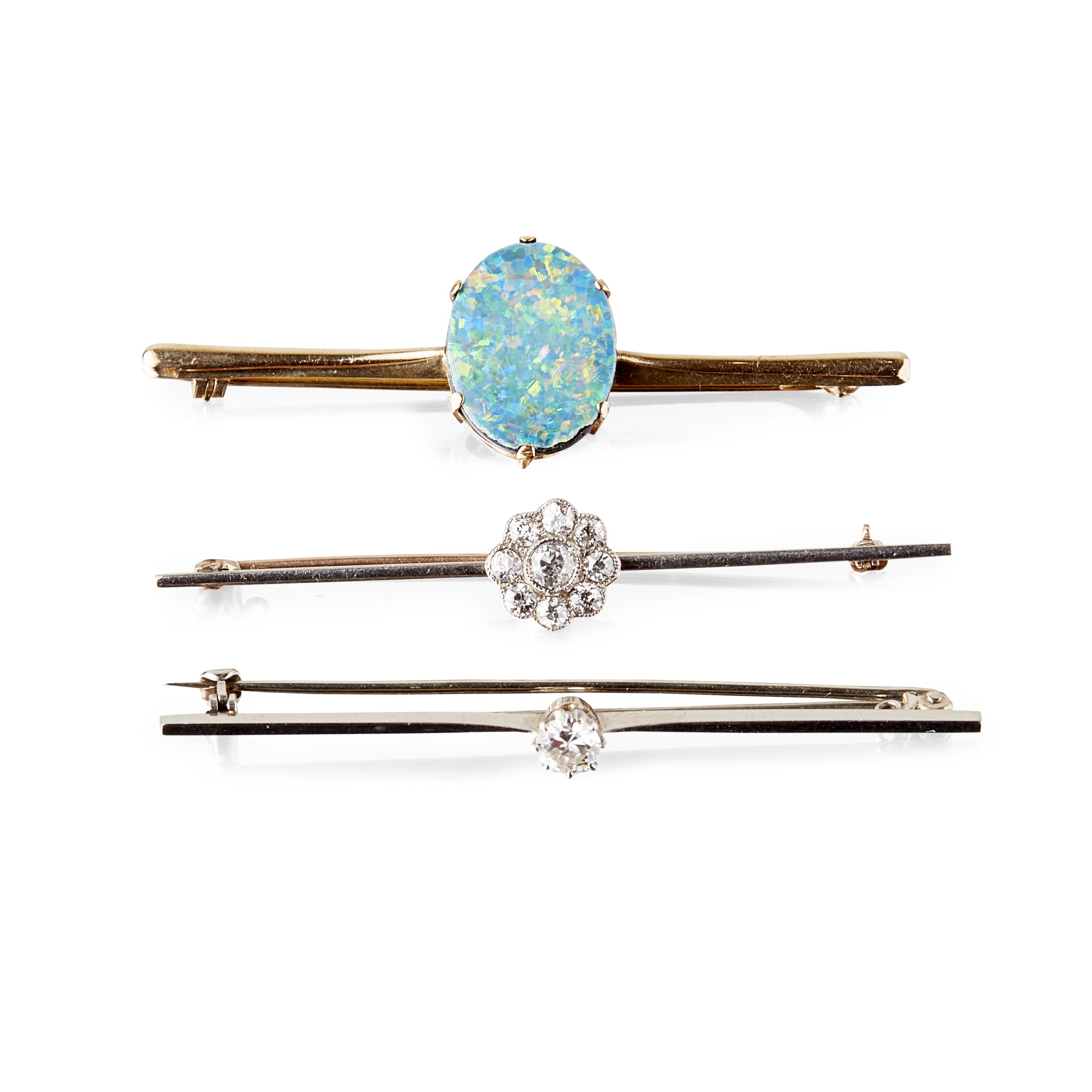 to include a single stone old round-cut diamond set bar brooch, unmarked; a diamond set floral cluster bar brooch, unmarked; an opal doublet set bar brooch