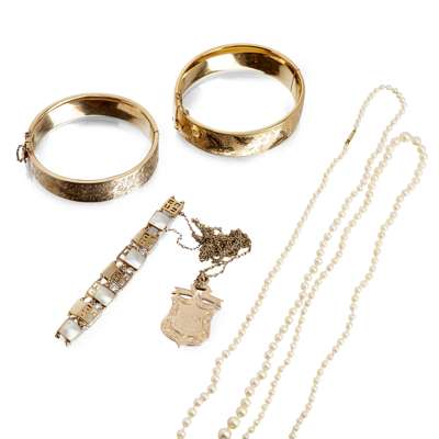 to include a 9ct gold hinged bangle with engraved foliate detail; a 9ct gold medal 'Awarded to James Hood’ and a gilt metal chain, a mother of pearl set bracelet stamped 9ct; together with a gilt metal bangle and two cultured pearl necklaces