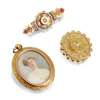 to include a circular diamond set brooch, stamped 15ct; a 15ct gold diamond set brooch, of similar design with foliate detail to shoulders, and a portrait miniature pendant