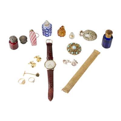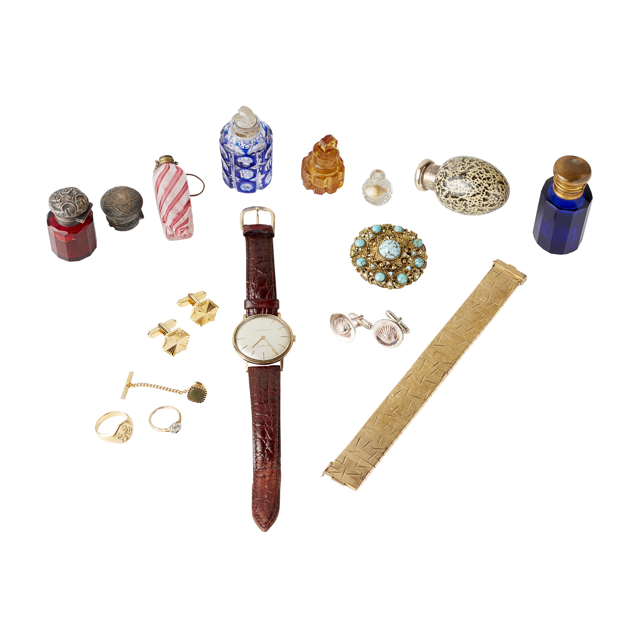 to include a 9ct gold articulated flat bracelet, with engraved bamboo flecks, to a concealed clasp; a diamond set cluster ring stamped 18CT (stone missing); a pair of cufflinks by Norman Hartnell; together with a turquoise set filigree brooch, an unmarked yellow metal signet ring, a pair of shell motif silver cufflinks, an Eterna wrist watch and a collection of snuff bottles