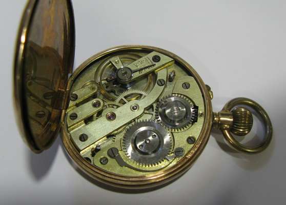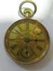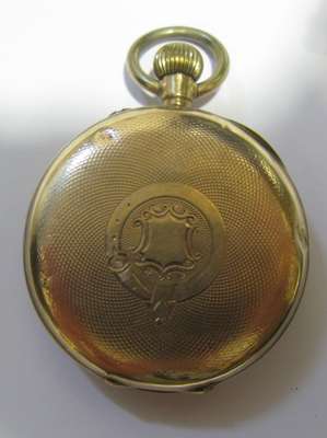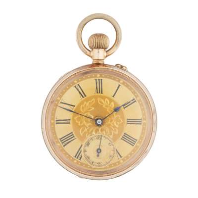 open faced, keyless wind, gilt dial with Roman numerals, subsidiary seconds dial, engine turned rear cover, gilt cuvette, plain lever movement