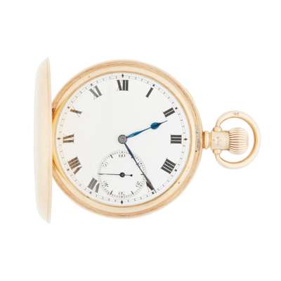 plain case, white enamel dial, Roman numerals, subsidiary seconds dial, English lever movement, keyless wind