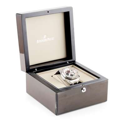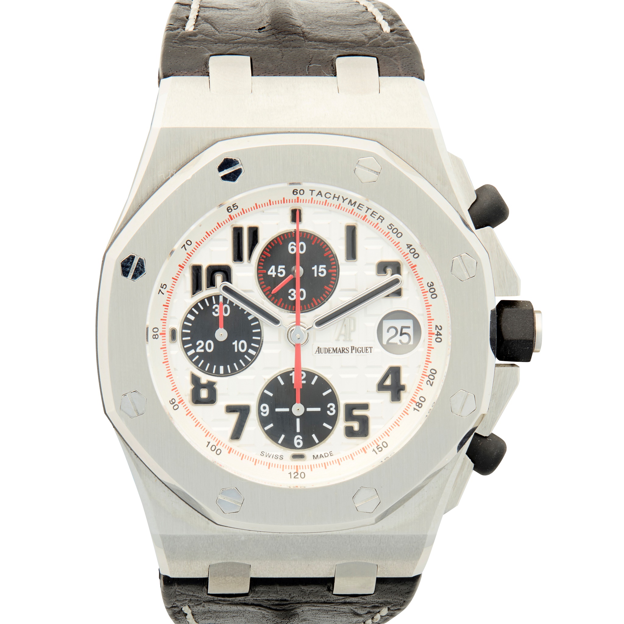 Royal Oak Off-Shore, Panda 18369, square tiled brushed silver dial, black register dials, red hands, screwed bezel, screw down crown, original leather strap with deployant buckle, in Audemars presentation box