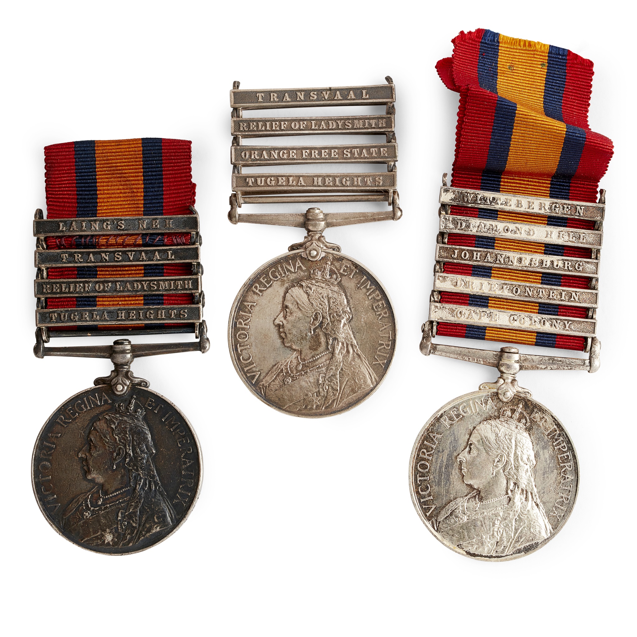 a five bars, Wiebergen, Diamond Hill, Johannesburg, Driefontein, Cape Colony, awarded to 3720 Pte T. Hackett W.Riding Regiment; 4 bars, Transvaal, Relief of Ladysmith, Orange Free State, Tugela Heights, awarded to 4101 Pte. C. Biles 13/Hussars (with ghost date); 4 bars, Laings Nek, Transvaal, Relief of Ladysmith, Tugela Heights, awarded to 802 TPR A Tacey Bethunes M I