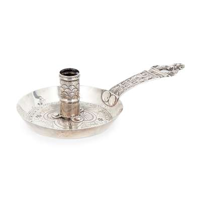 two marks, A and ID? in oval punch, possibly German, the cast flat handle decorated with a lion finial standing on a Doric plinth, to a flat handle with two Renaissance style figures, the rear with crude pricked initials, the base of circular form, splayed side with two large rivets attaching the handle, the circular base with punch work borders and engraved palmette motifs, the sconce with chased leaf detail, slider with mask motif
