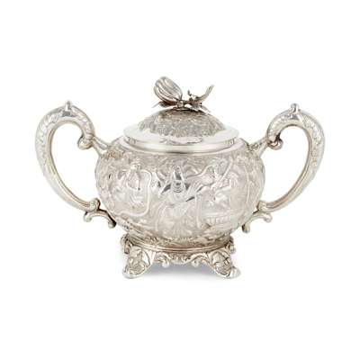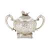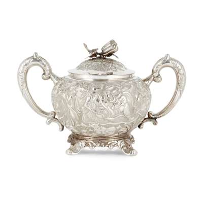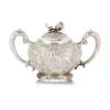 of baluster form, with chased figurative detail throughout, two C-scroll handles the pull-off cover with gourd finial, to four bracket feet with shell detail, character marks to bottom