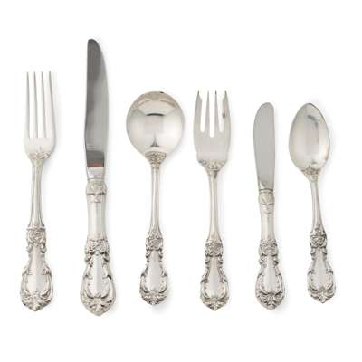 Reed and Barton, mid-20th century, marked sterling and Burgundy pattern comprising; twelve large and small knives, stainless steel blades; twelve soup spoons; twelve dessert forks; twelve medium spoons; twelve table forks