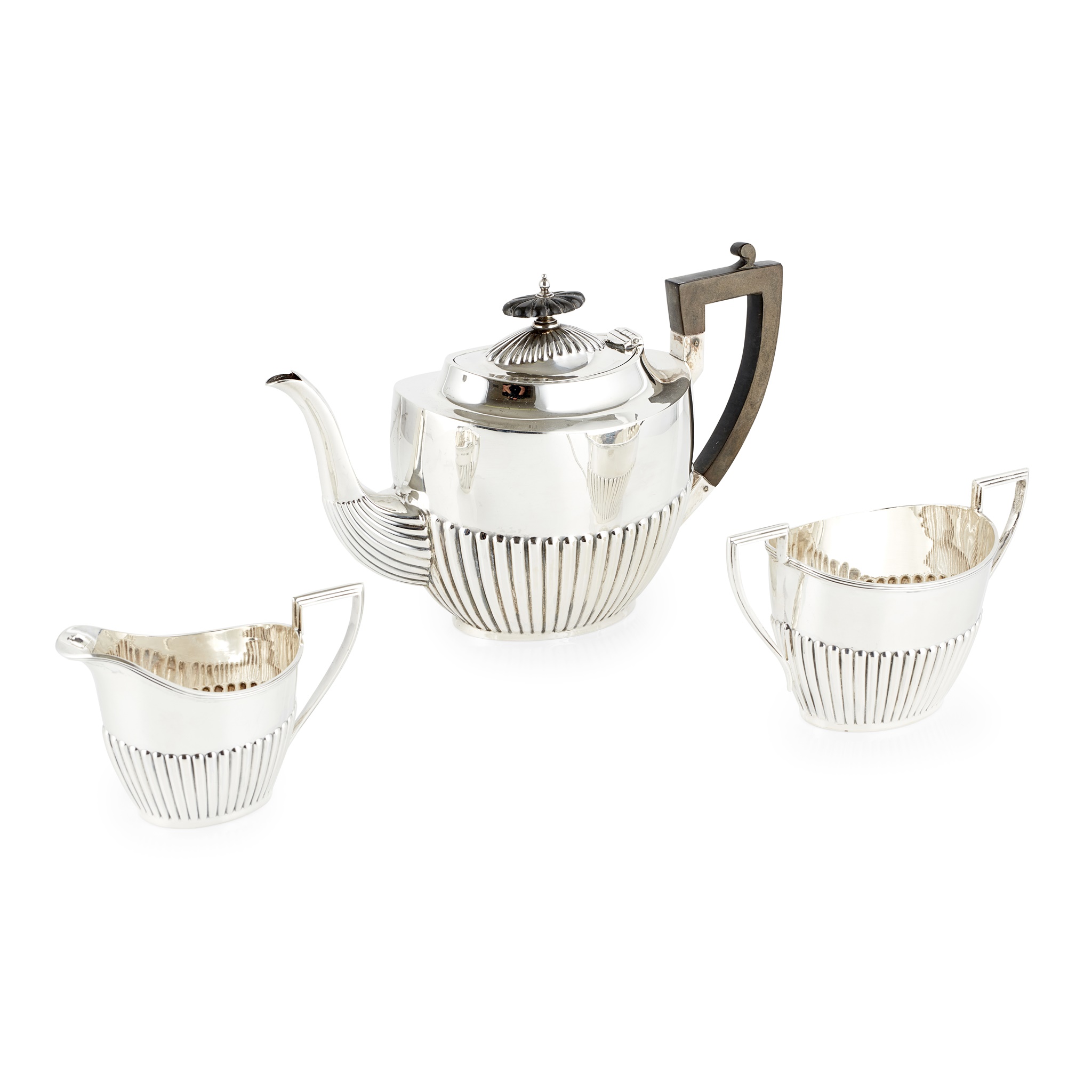 Walker and Hall, Sheffield 1917, comprising teapot, twin handled sugar basin and milk jug, all of oval demi-fluted form, angular handles, the teapot with presentation engraving 'Presented to A Bruckshaw... 11th May 1918'