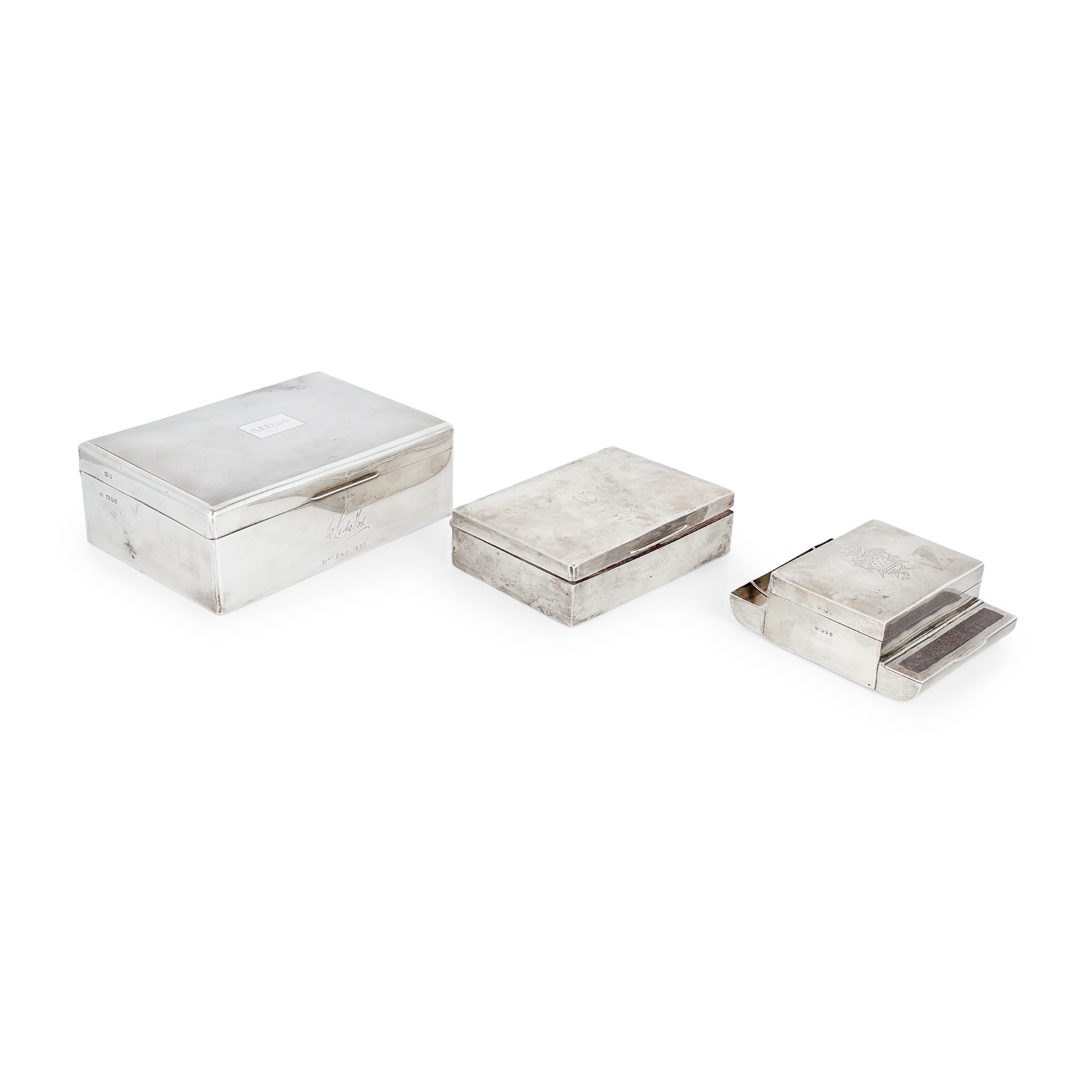 all of rectangular outline, the largest with engine turned detail, all with engraved initials or crest, the smallest with vesta and pen tray to sides