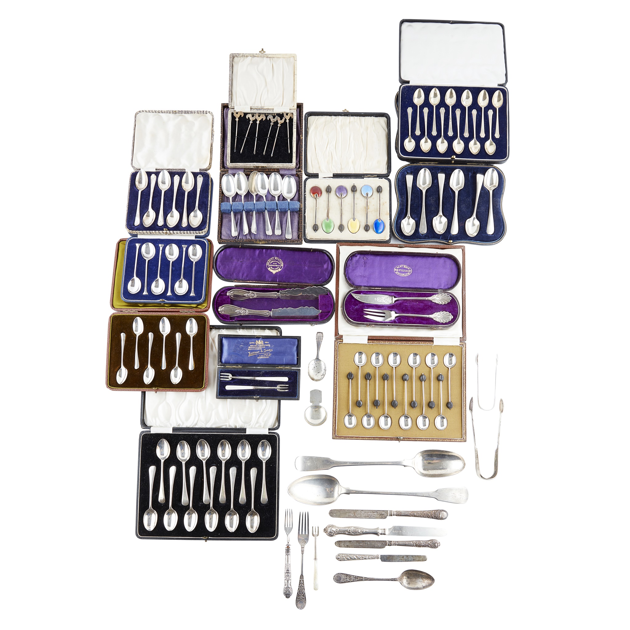 comprising thirteen cased set of mainly teaspoons and coffee spoons, also cocktail sticks, pickle forks, and fish knives; together with various pieces of loose flatware