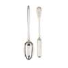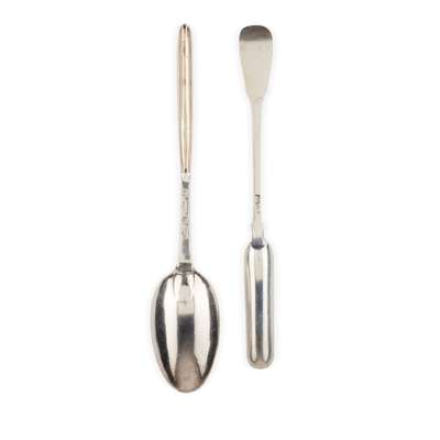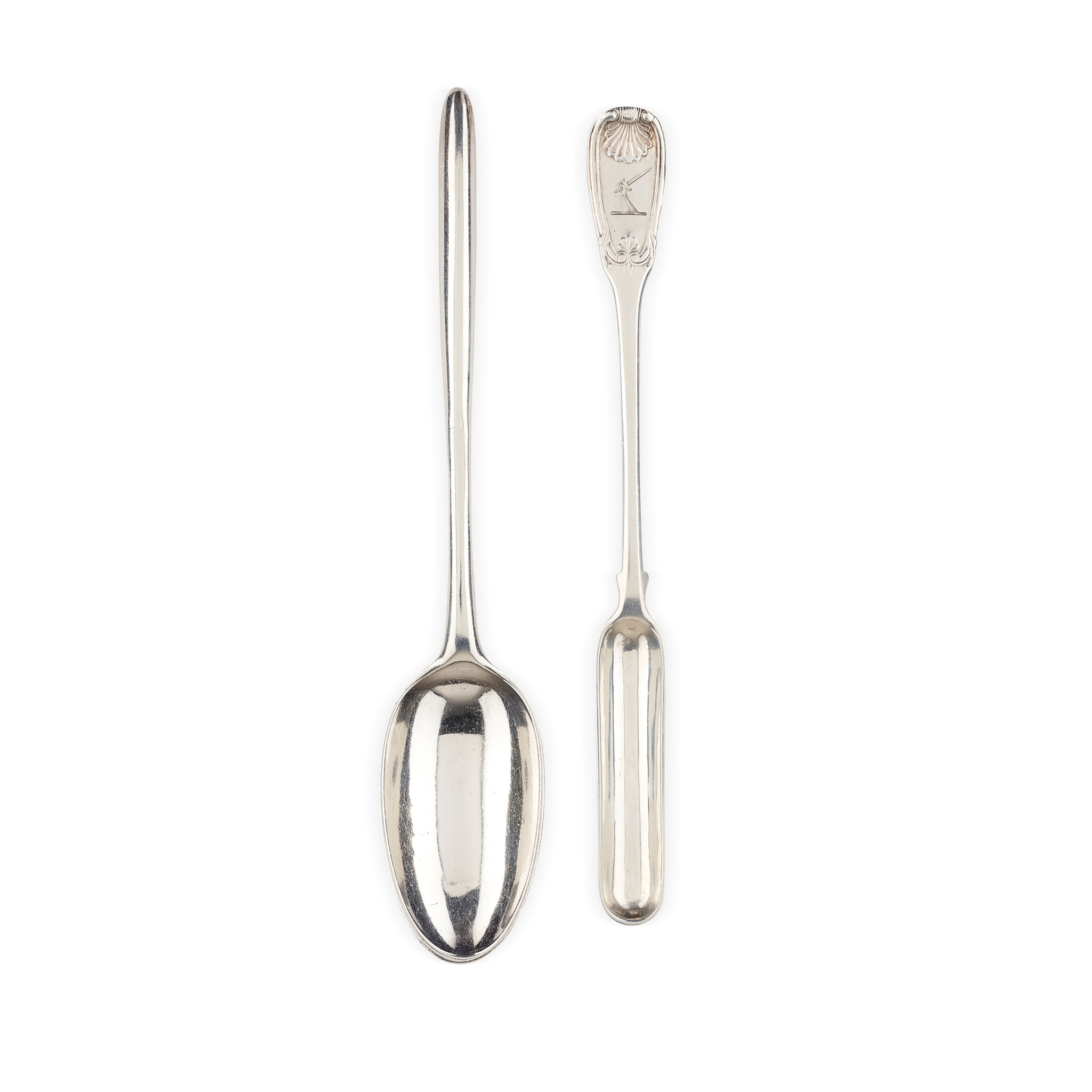 Lothian & Robertson, Edinburgh 1758, with the slim scoop stem facing downwards and ovoid bowl; together with a George III Marrow Scoop, Robert Gray & Son, Glasgow 1814, of single struck Fiddle and Shell pattern, engraved crest to terminal