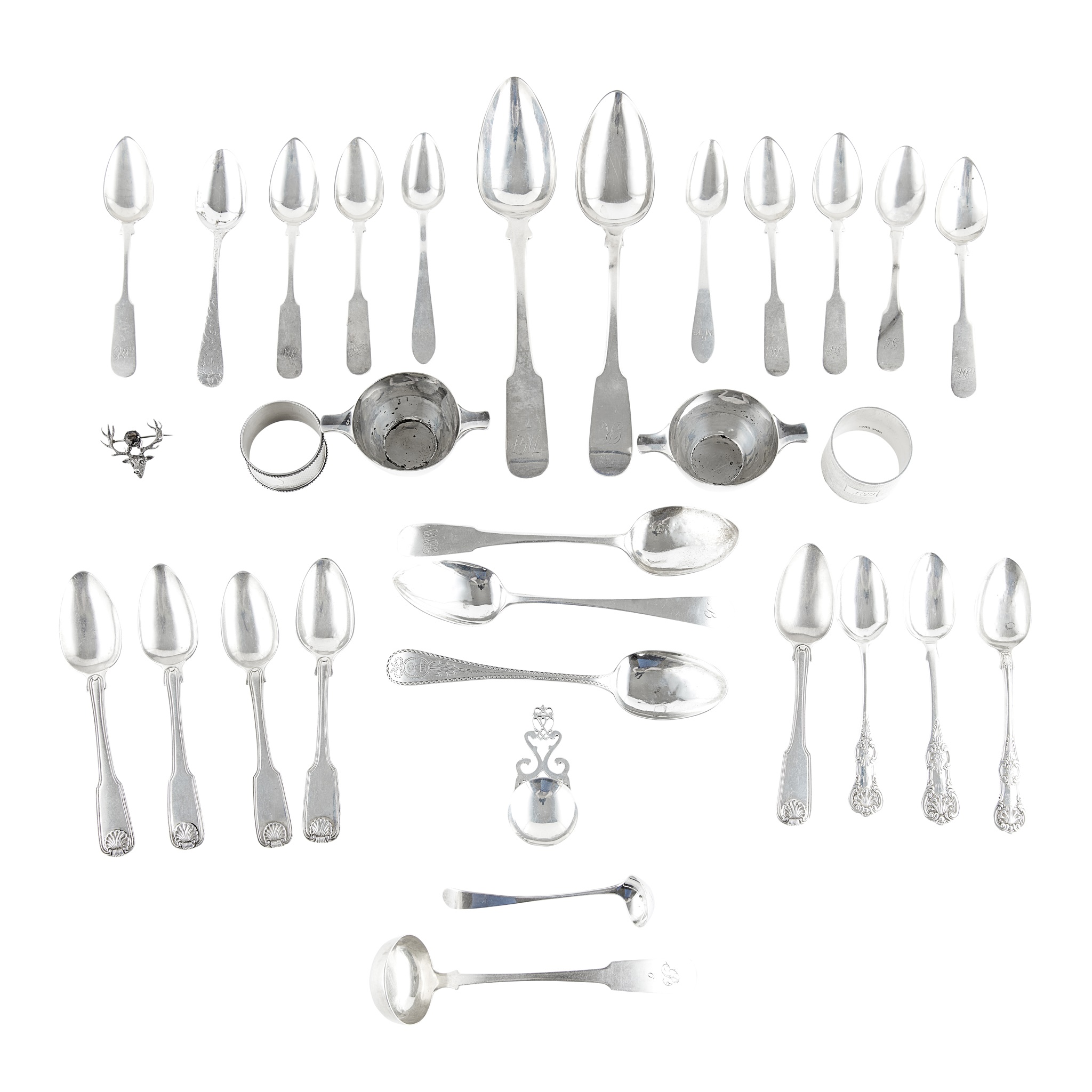 to include, a set of six teaspoons, Cameron of Dundee, marked CAM/ERON, C, thistle, pot of lilies, DUN/DEE, of Fiddle pattern; together with various teaspoons, tablespoons, desert spoons, napkin rings, caddy spoon, etc Qty