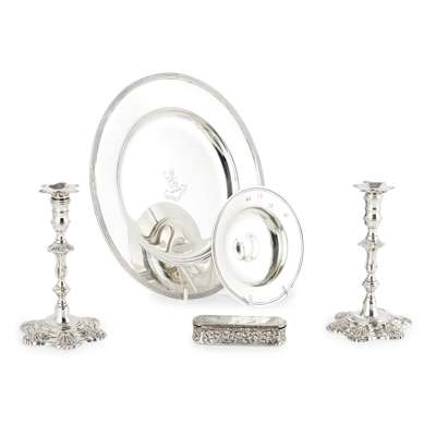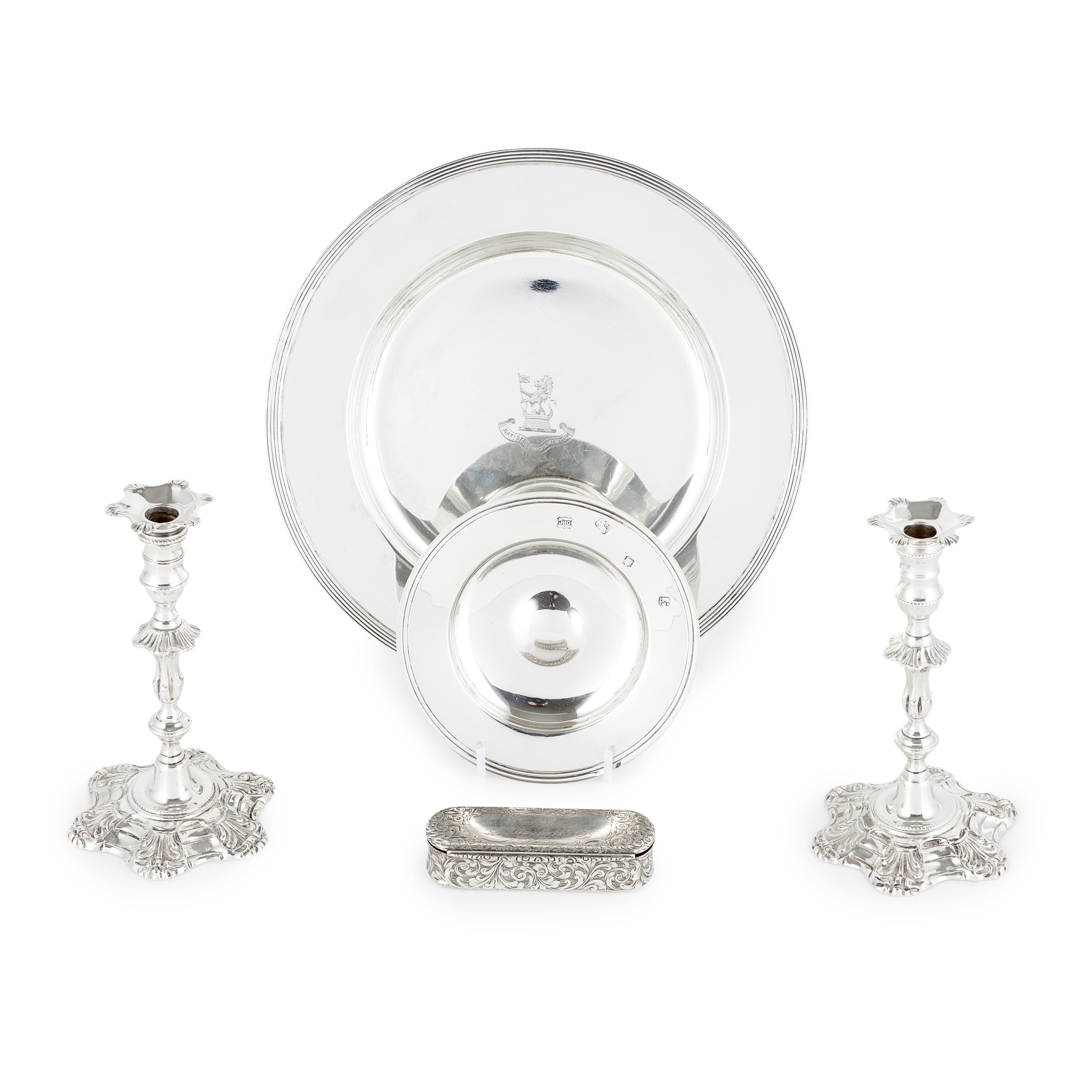 Maxfield & Sons, London 1894, of circular form, threaded edge, with crest engraved to centre; together with a pin tray modelled as an Armada dish, John Henry Odell, London 1965; a Victorian snuffbox, Birmingham ES, of oval form, floral chased decoration throughout and a pair of cast 18th century style sticks, J B Chatterley & Sons Ltd, Birmingham 1966, with removable sconces