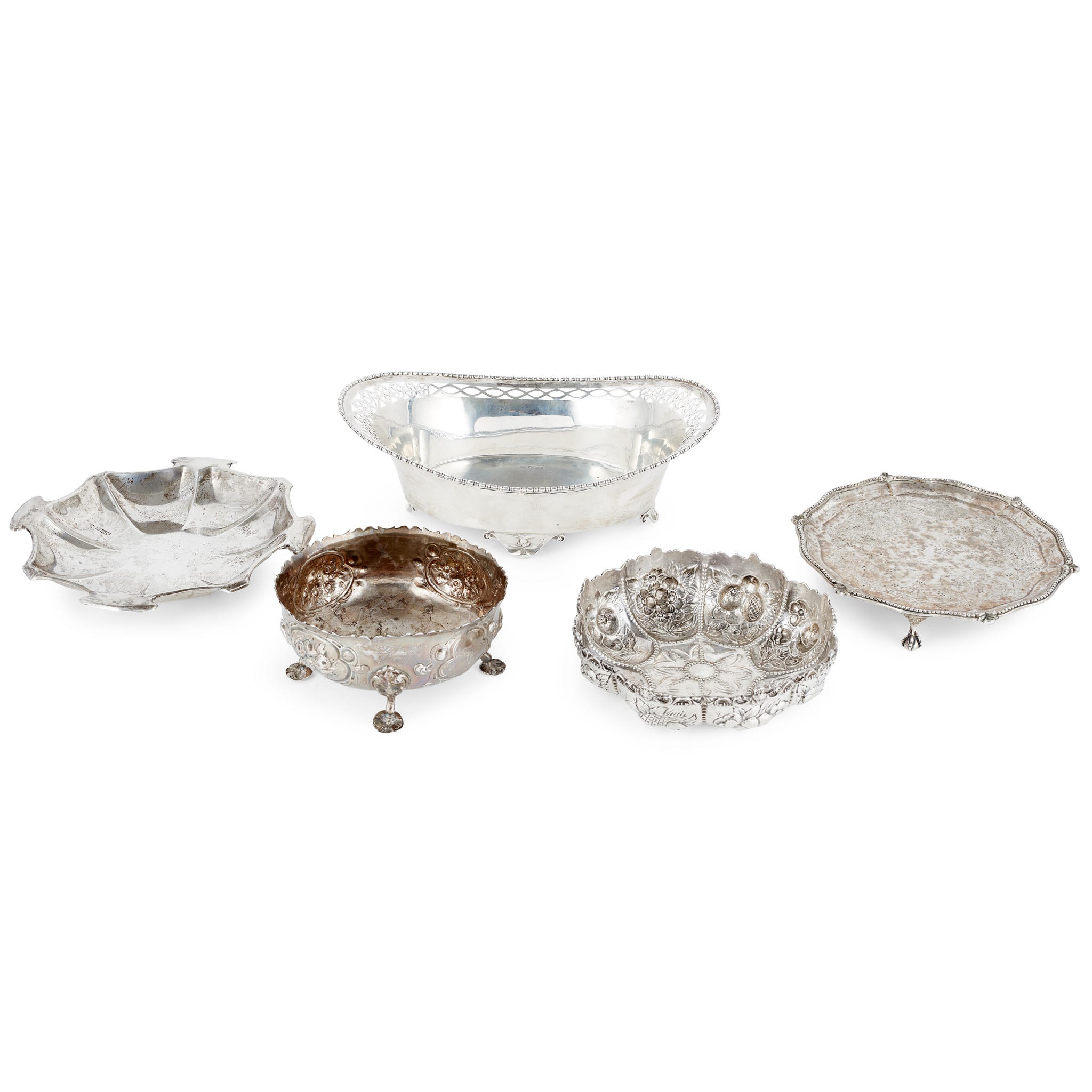 to include; a Victorian card tray, of circular outline, with beaded rim and engraved detail, London 1868; a Victorian sugar bowl, with embossed foliate detail, London 1853; a Victorian lobed bowl with embossed floral detail, London 1884, a modern bread basket, oval outline with pierced detail, Sheffield 1922, a modern shallow bowl with shaped outline, London 1905