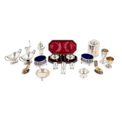 to include; a pair of oval open salts with pierced detail and blue glass liners, London 1900, a pair of twin-handled open salts with bright-cut detail, London 1880; a cased set of open salts with foliate detail, Sheffield 1891; a set of four egg shaped salt and peppers, a pair of horn and silver mounted peppers; together with various condiments