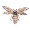 modelled as a bee, claw set with a cushion-cut sapphire to the body, rose-cut diamonds throughout, with ruby set eyes, unmarked