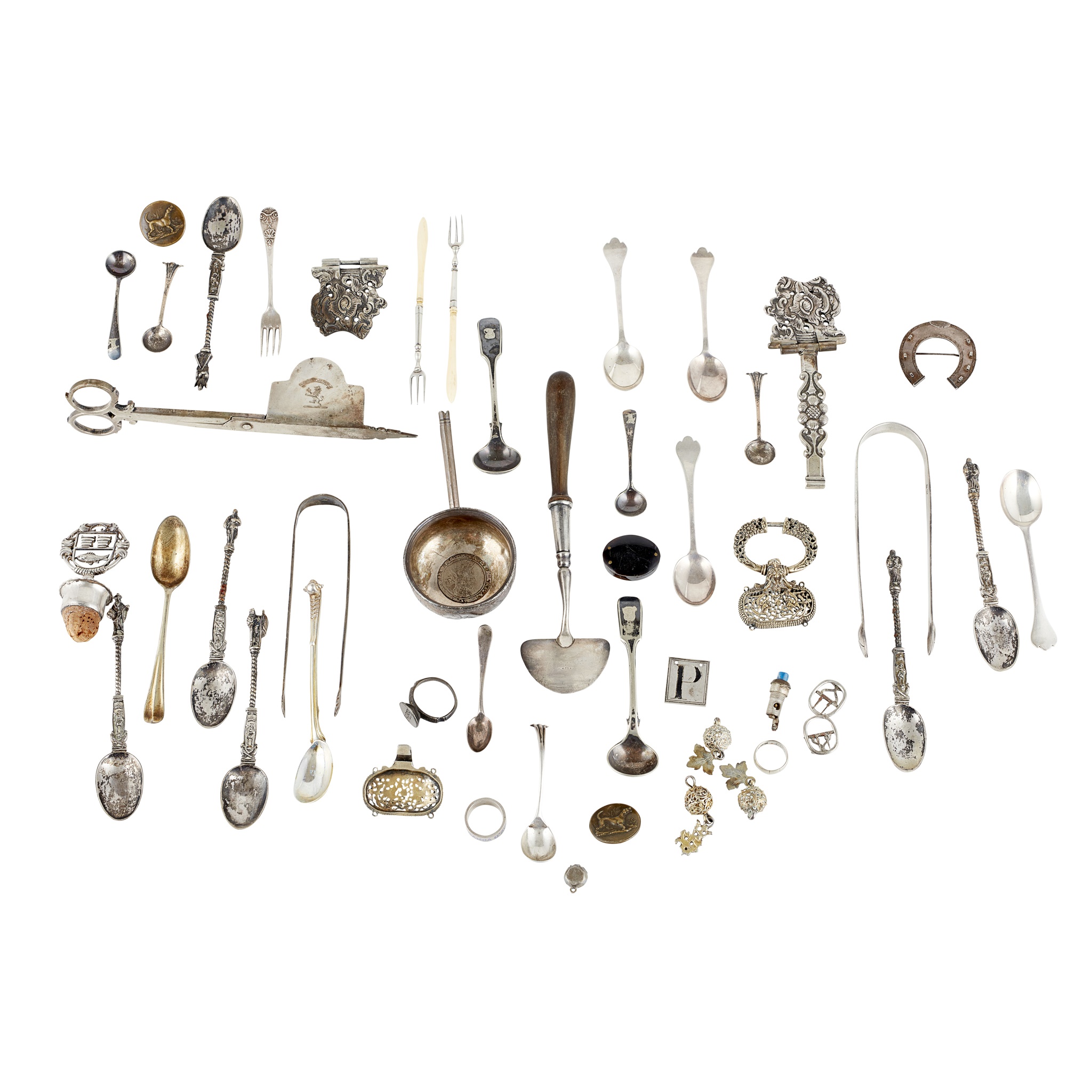 various patterns, including Apostle spoons, Onslow pattern etc; also to include, a pair of white metal candle snuffers, punch ladle bowl only, and various sundry items