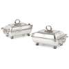 the lids and bases marked John Houle, London 1811, of rounded rectangular form, gadrooned borders, engraved coat of arms and armorials, with a cast acanthus handle, the base with similar gadrooned border, the plated lower water dish with scroll bone handles, raised on four bun feet