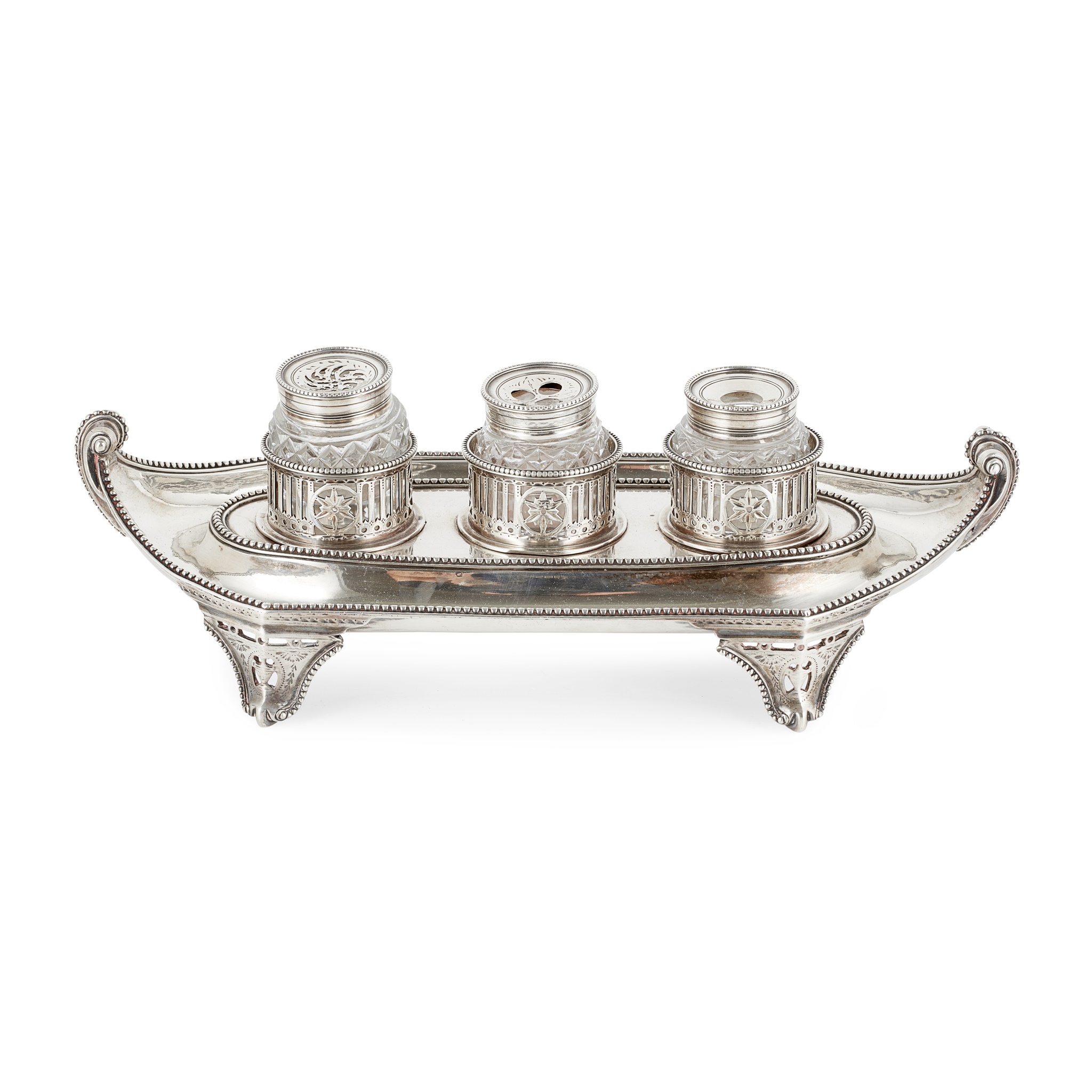 William Plummer, London 1784, of elongated hexagonal boat form, with beaded borders, the central tray with three pierced circular wells and three cut glass bottles, all raised on four pierced and beaded bracket feet, slight engraved detail
