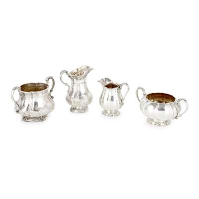 WE, London 1821, both of baluster form with ribbed detail, swept circular foot, leaf-capped C-scroll handles; together with a matched sugar bowl and cream jug; of swept baluster form with scrolling foliate design, Chester 1911 and London 1866