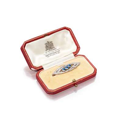 of elliptical form, set with three graduated round-cut sapphires, in a pierced border of graduated eight-cut diamonds, stamped PT, numbered 5833, in a fitted case for Carrington & Co