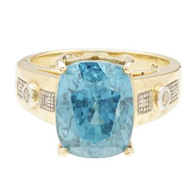 claw set with a mixed cushion-cut zircon, each shoulder collet set with a round brilliant-cut diamond and three further small round-cut diamonds, to a plain shank
