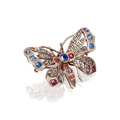 set throughout with sapphires, rubies and rose-cut diamonds, with detachable brooch fitting, unmarked
