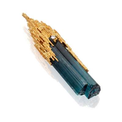 the stylised and textured mount clasping a blueish-green tourmaline crystal, small round brilliant-cut diamond detail, stamped GRIMA, hallmarked for HJ Co, London 1968; in original box