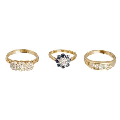to include a Victorian 18ct gold triple-cluster diamond ring, an 18ct gold five stone diamond ring, and a sapphire and diamond ring, stamped 18ct