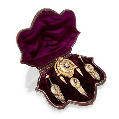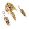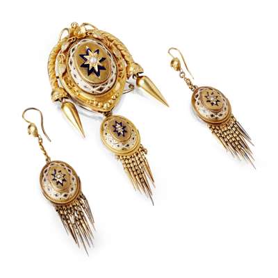 the brooch of oval scrolling form with pendant drops, applied foliate detail, the central pearl in a blue and while enamel border, suspending a similar oval drop with fringed detail, glazed panel; the pendant earrings of matching design, both unmarked, in a fitted case