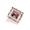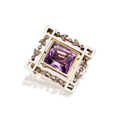 collet set with a square-cut amethyst in geometric white enamel border with rose-cut diamond set floral detail, with brooch and pendant fittings, unmarked