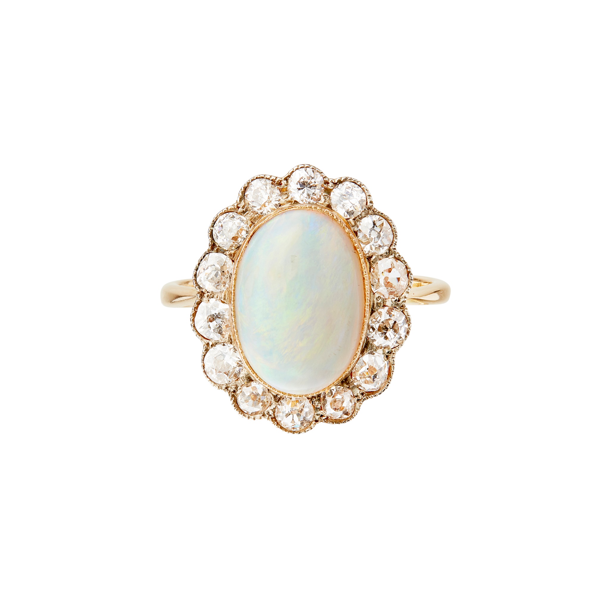 claw set with an oval opal cabochon, in a single border of old round-cut diamonds, to a plain shank stamped 18ct