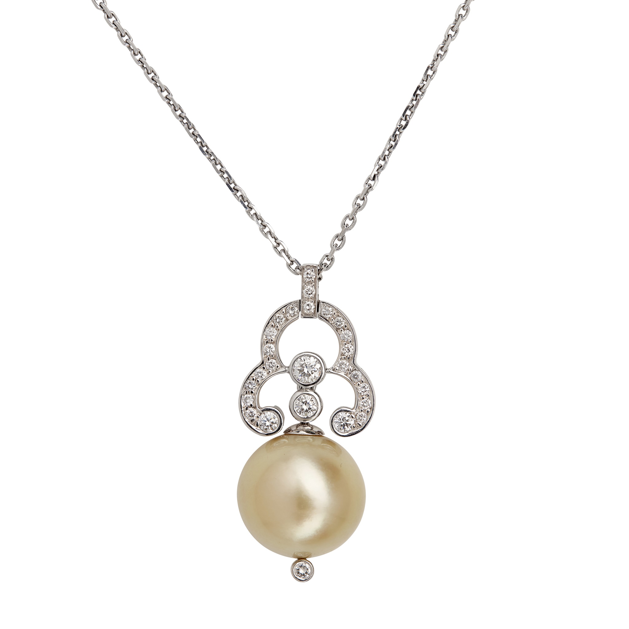 the pierced scrolling bale pavé set with graduated round brilliant-cut diamonds, suspending a golden South Sea pearl and small collet set diamond, to a trace link chain by Chopard, stamped 750