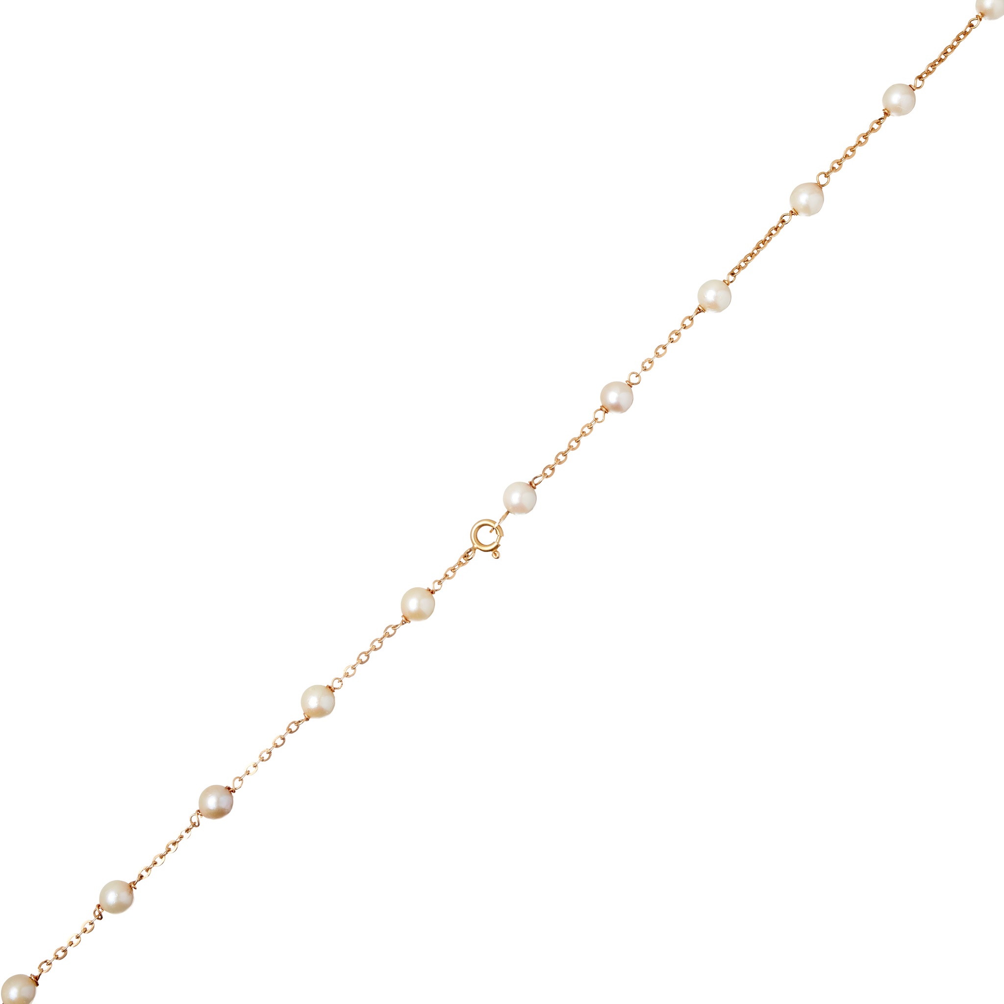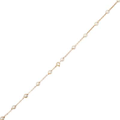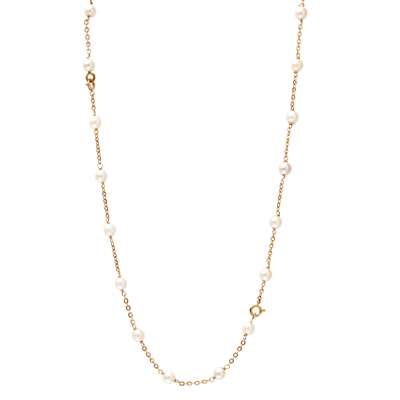 composed of a belcher link chain set at intervals with cultured pearls, to four bolt ring clasps allowing it to be four bracelets, stamped 750