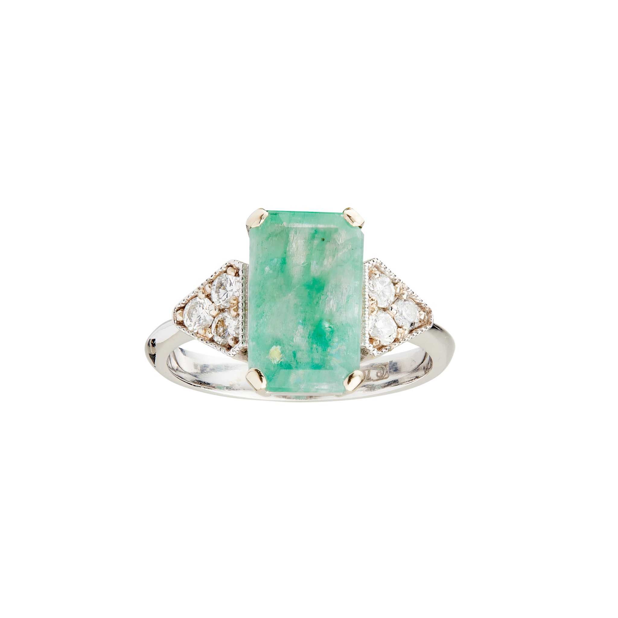 claw set with an emerald-cut emerald, each shoulder set with three round brilliant-cut diamonds, to a plain shank stamped 750