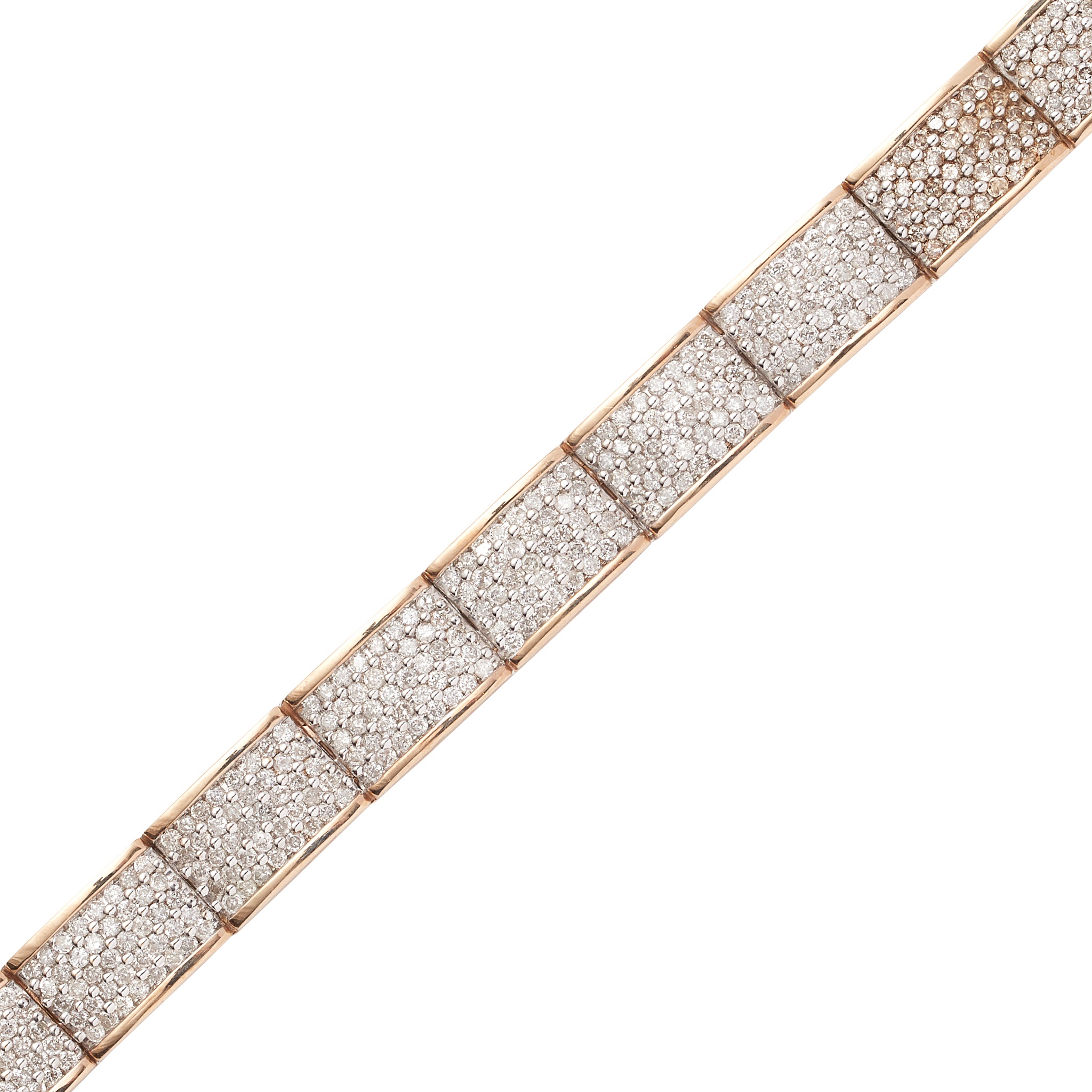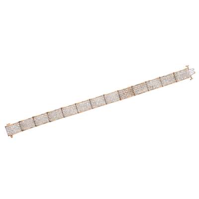 composed of thirteen slightly curved rectangular links, each pavé set with five rows of eight small round brilliant-cut diamonds, to a concealed clasp and safety clip
