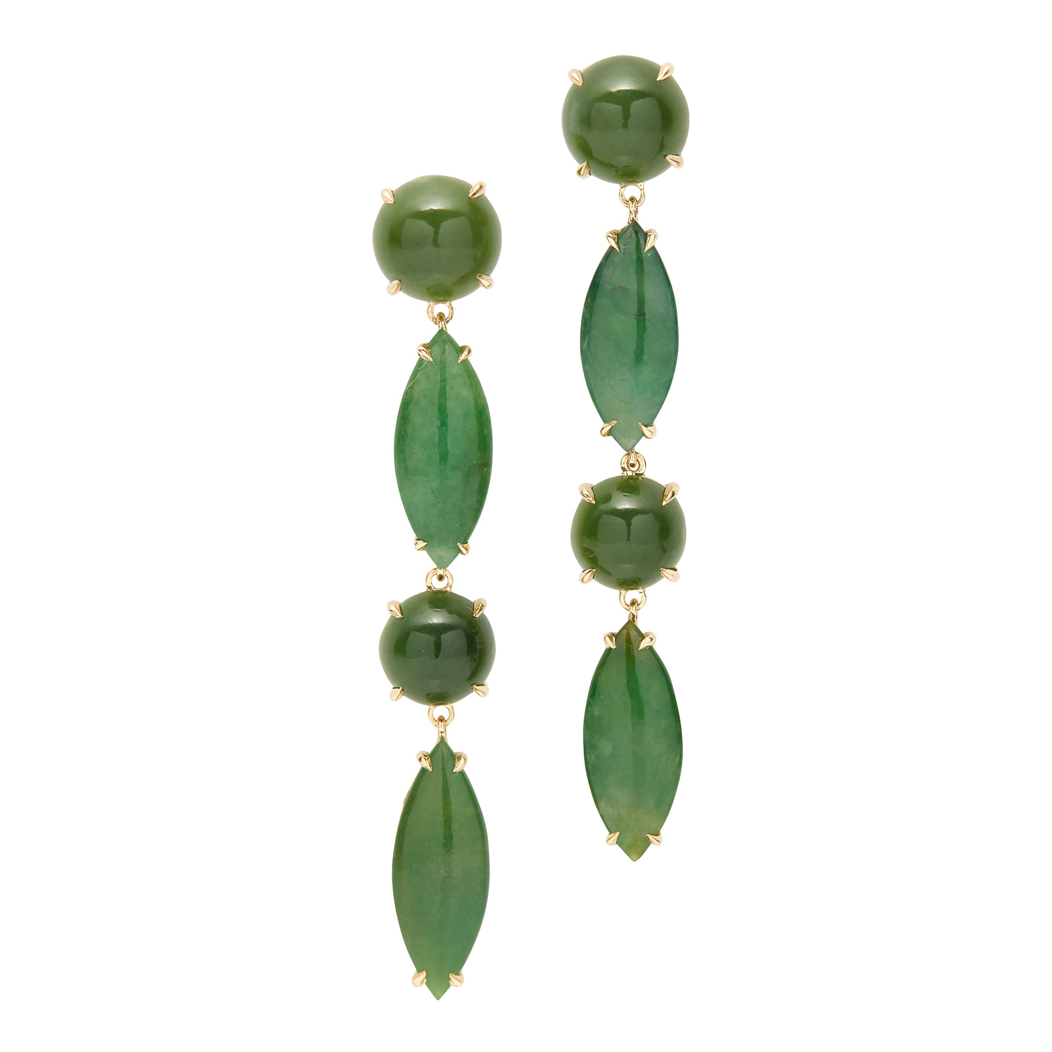 each composed of alternating round and marquise shaped jadeite and nephrite cabochons, to post and butterfly fittings, stamped 750