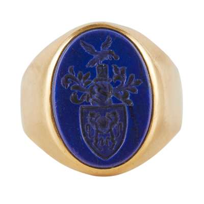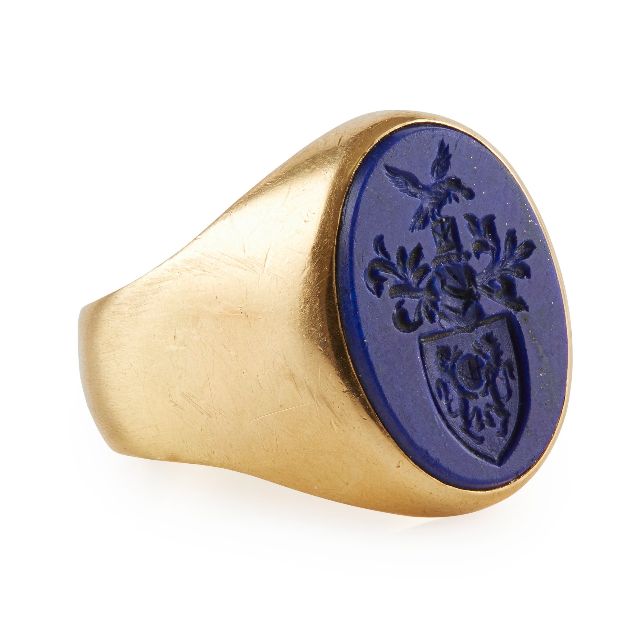 apparently unmarked, the oval lapis lazuli insert well carved with armorials, plain mount and shank