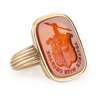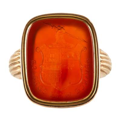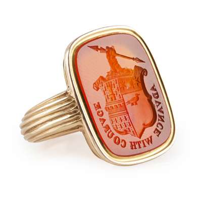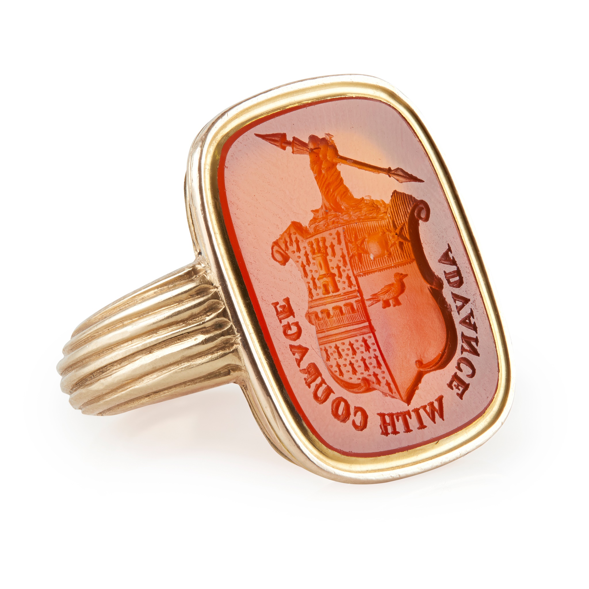 unmarked, the rectangular matrix with armorials and motto; 'advance with courage' for Marjoribanks impaling Delatour, channel set, the gallery frame stepped and on shank with deep ribbed detail