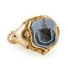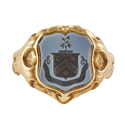 IB, London 1863, the shield shaped inset sardonyx with engraved shield, crest and motto, the conforming rub-over setting with Gothic style carved shoulders, plain shank, the interior engraved: 'A G Finlay from the family of his late friend John Brown In remembrance 7th Feb 1865'