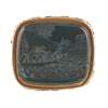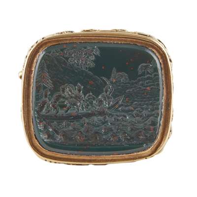 unmarked, the rectangular bloodstone matrix carved with a scene of Chinese people on board a small boat fighting a sea monster, foliate and ribbed decorated mount
