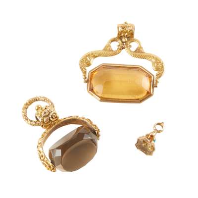 a large swivel fob with canted rectangular pale citrine panel, simple wire frame, the arms modelled as scrolling serpents and floral decorated barrel; a small gold fob seal, the shield shaped citrine panel with one word engraved, turquoise set support; a smoky quartz swivel fob, the polished three sided stone blank matrices, foliate decorated hoop