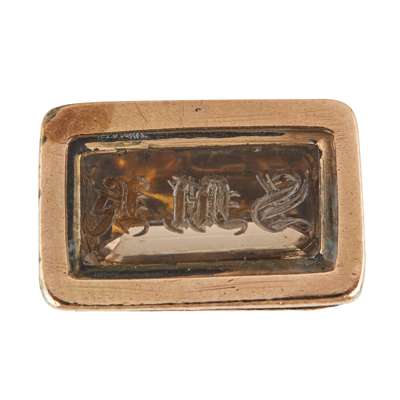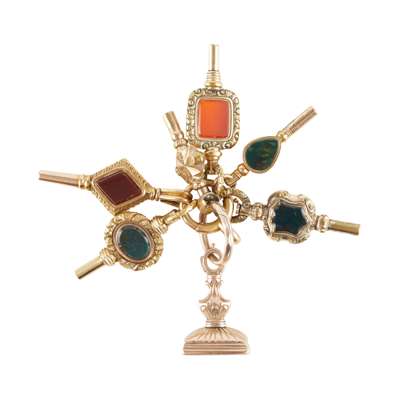 the seal of rectangular form, engraved initials, the keys all decorated, cast borders and frames, each set with various polished hardstone inserts