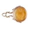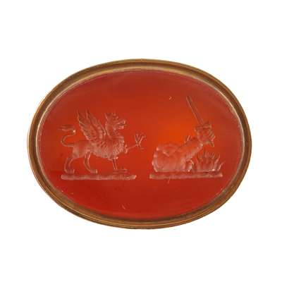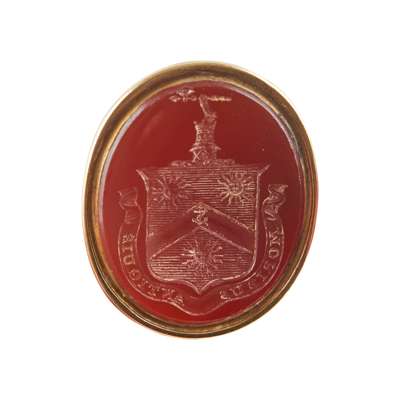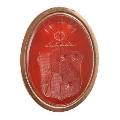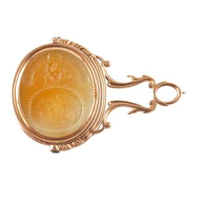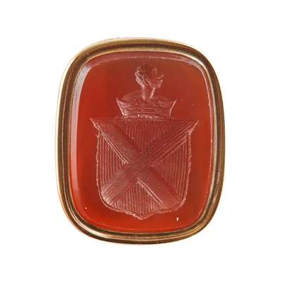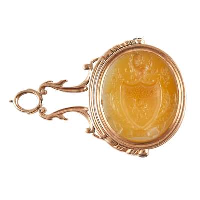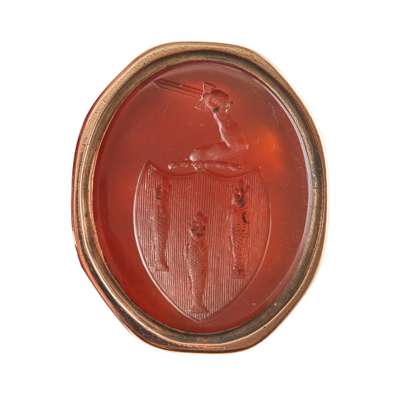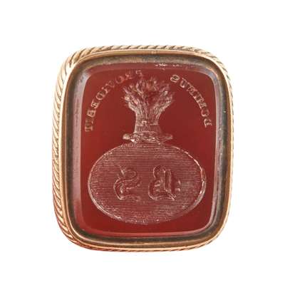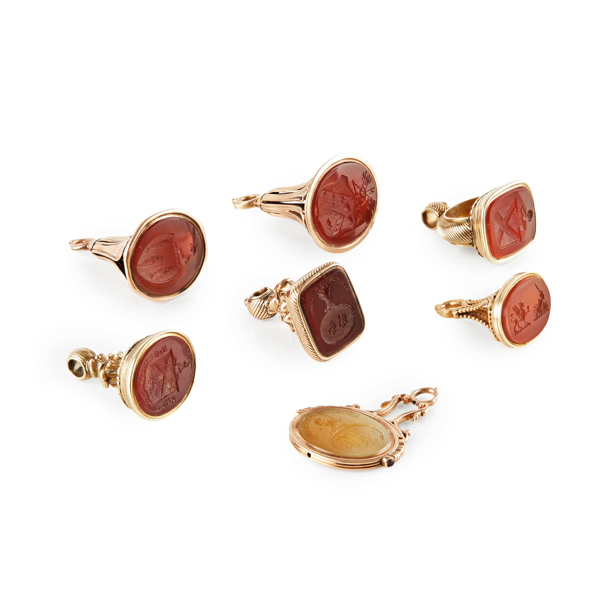 to include a George III swivel seal, the oval carved double sided matrix with full armorials and the other side with monogram, crest and motto, 'Jucidior in tenebris' for Inglis; two fob seals each with engraved carnelian matrices with shields, one with a motto, 'Moribus Antiouis', ribbed gold mounts; two similar early 19th century rose gold fob seals, each with an oval engraved matrix of a shield and crest, simple tall pierced and engraved upright panels to the suspension rings; a gold mounted fob with carnelian engraved matrix with two crests; another gold fob with engraved carnelian matrix carved with an oval with initials BS, crest and motto, 'Dominus providebet' (The Lord will provide)