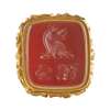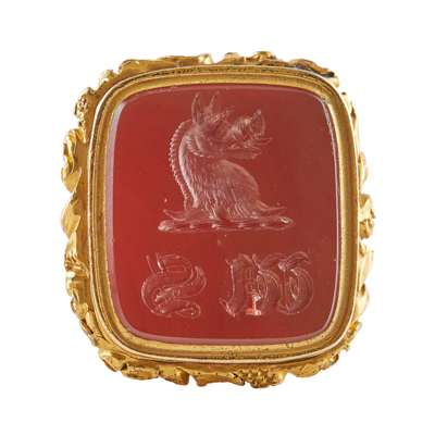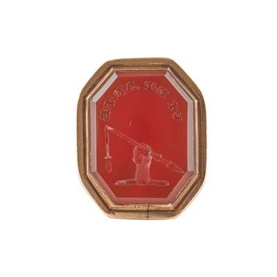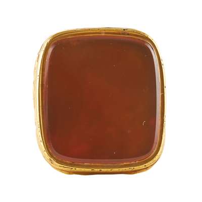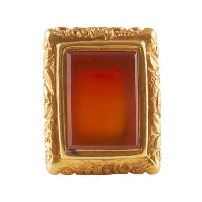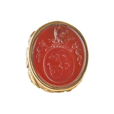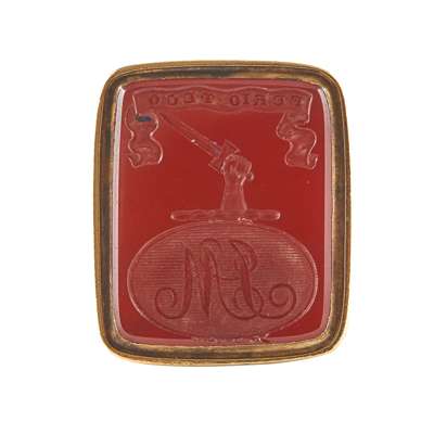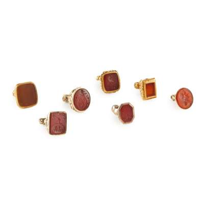 unmarked, two with blank carnelian cartouches, well chased mounts; another with oval carnelian matrix of a man's head in profile with a beard and long hair, rose gold skeleton type frame; a seal with rectangular carnelian matrix, engraved initials and Boar's head crest, detailed floral decoration to the body and hoop; an early 19th century small seal with canted rectangular panel, crest and motto for possibly Seale, simple threaded and ribbed detail wrythen hoop support; another with rectangular carnelian matrix engraved crest of hand holding a sword, motto 'Ferio Tego' (I strike, I cover) and initials PM in script, foliate decorated body and support; a oval fob seal with engraved carnelian oval shield with initials and crest of a boar's head with dagger through the neck, floral garlands, simple threaded rub over border, chased shell decoration
