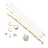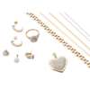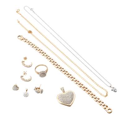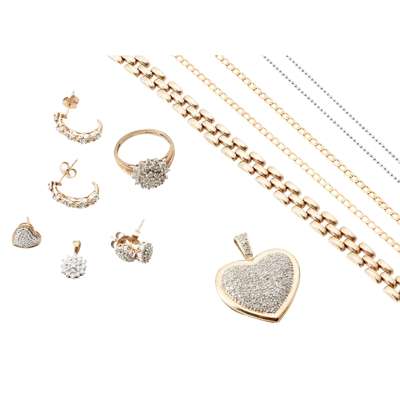 to include a 9ct gold pavé set diamond heart pendant, a pair of unmarked diamond cluster earrings and a matching pendant; a 9ct gold diamond cluster ring; a diamond set pendant to a ball-link chain, stamped 750, a pair of 9ct gold diamond set earrings, a single heart shaped earring; a 9ct gold brick-link bracelet and a 9ct gold flattened link necklace