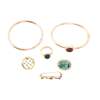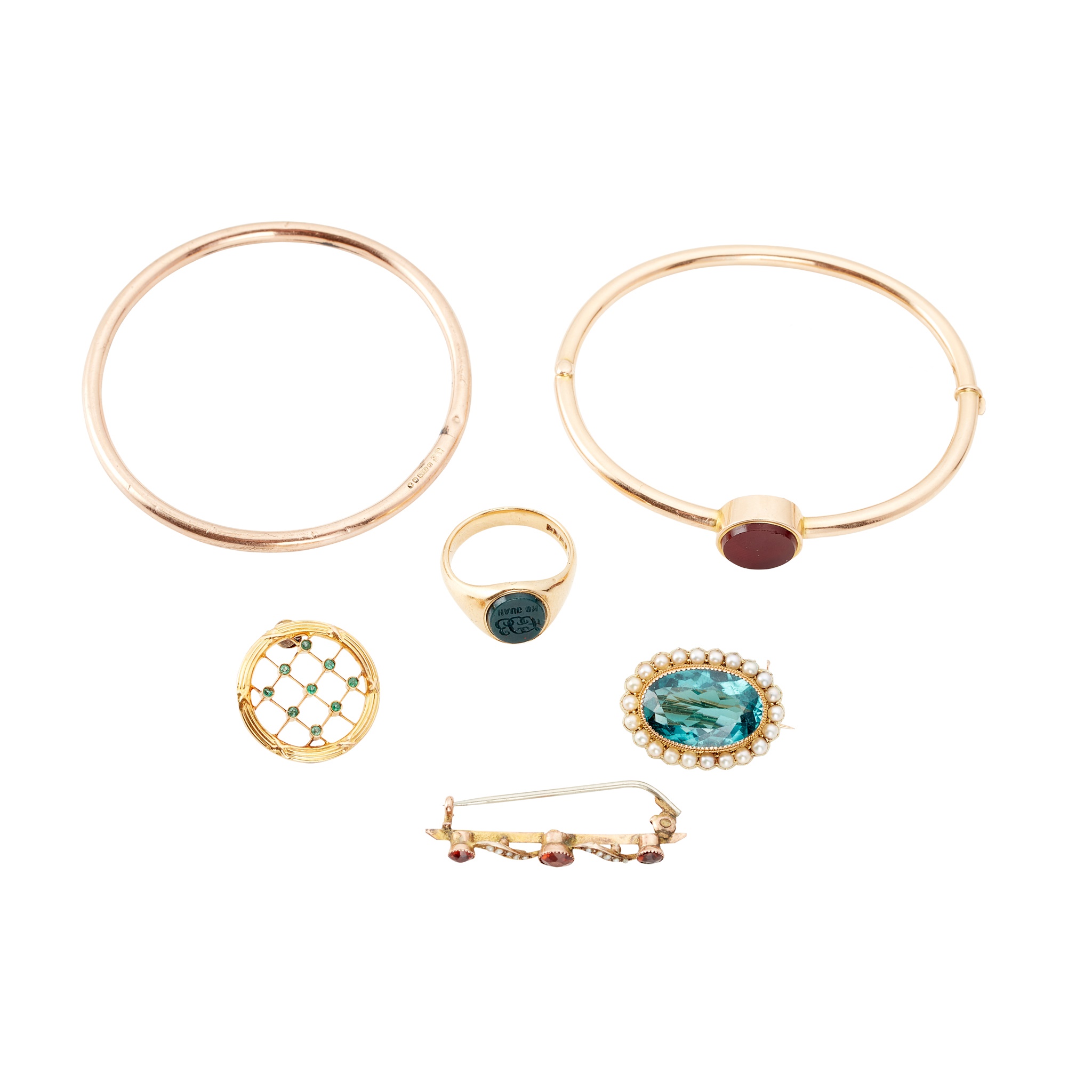 to include an agate set bangle, unmarked; a plain 9ct yellow gold bangle; together with three various gem set brooches