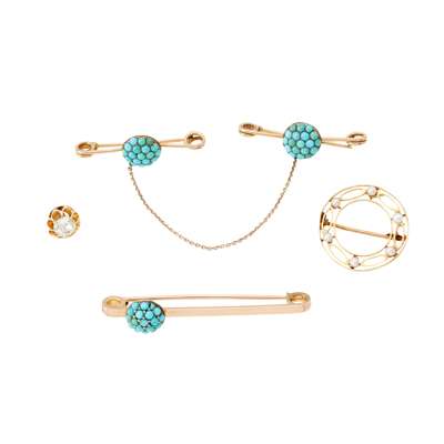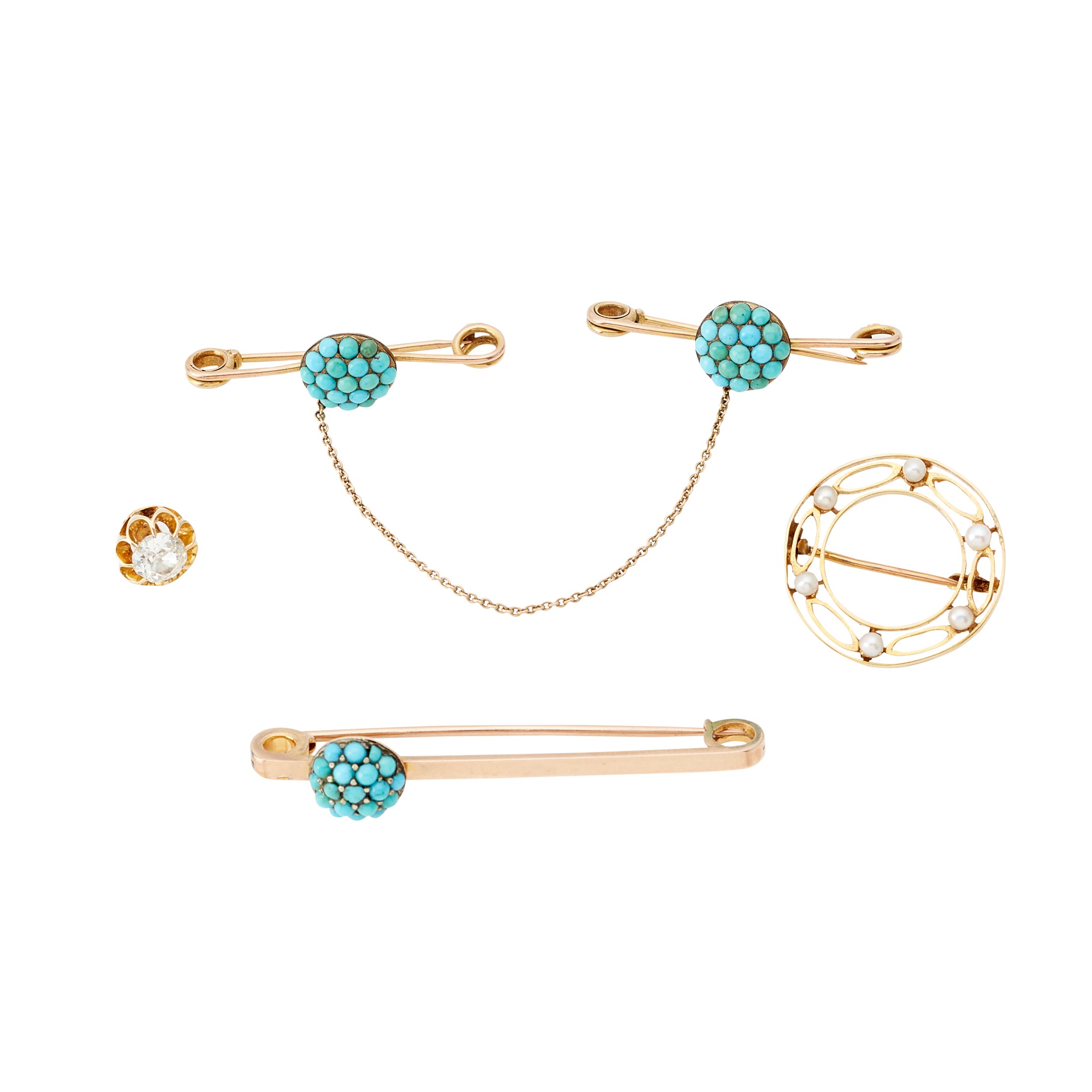 to include an old round-cut diamond set screw fitting, unmarked; a pair of turquoise set pin brooches, and another larger example, unmarked; and a seed pearl set brooch, stamped 15ct, in a fitted case for Sorley ... Glasgow