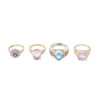 to include a bi-coloured 9ct gold blue topaz and diamond set cocktail ring, with pierced detail to shoulders; a 9ct gold pink spodumene and diamond set ring, a 9ct gold single stone rose-quartz set ring and a 9ct gold multi-gem set cluster ring