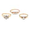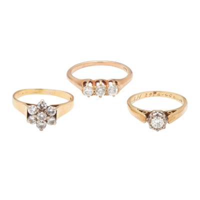 to include an 18ct gold diamond cluster ring, an 18ct gold single stone diamond ring and a three stone diamond ring, stamped 14K